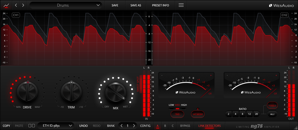 · Saturation Mode – a dedicated control simultaneously adjusts input and output (compression circuit disabled),